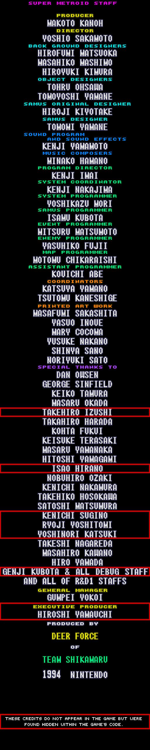 *The unused credits were discovered by hacker Kejardon while hacking a Super Metroid savestate. The ordering of the credits is unclear, as is their roles, so most names have been added to the Special Thanks section. The credit “SPECIAL THANKS TO GENJI KUBOTA & ALL DEBUG STAFF” is a hidden message in ASCII text that was never meant to be viewed in the credits and was meant for the developers only.