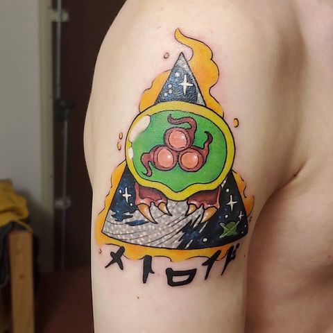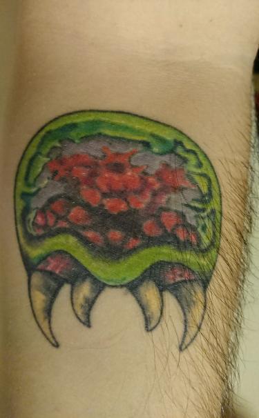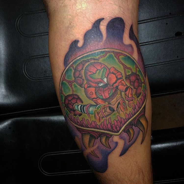 king_dan_productions got this beauty of a tat last year, and it was his second tattoo. The Super Metroid piece was done by the talented Jay Noska, and king_dan_productions spent about 4 hours in the chair.