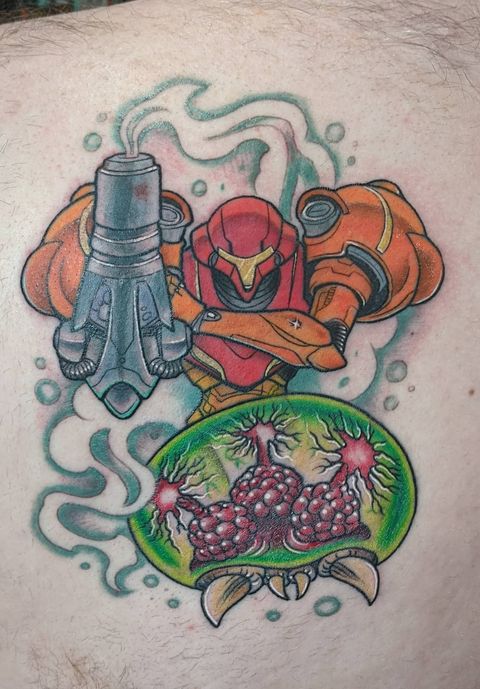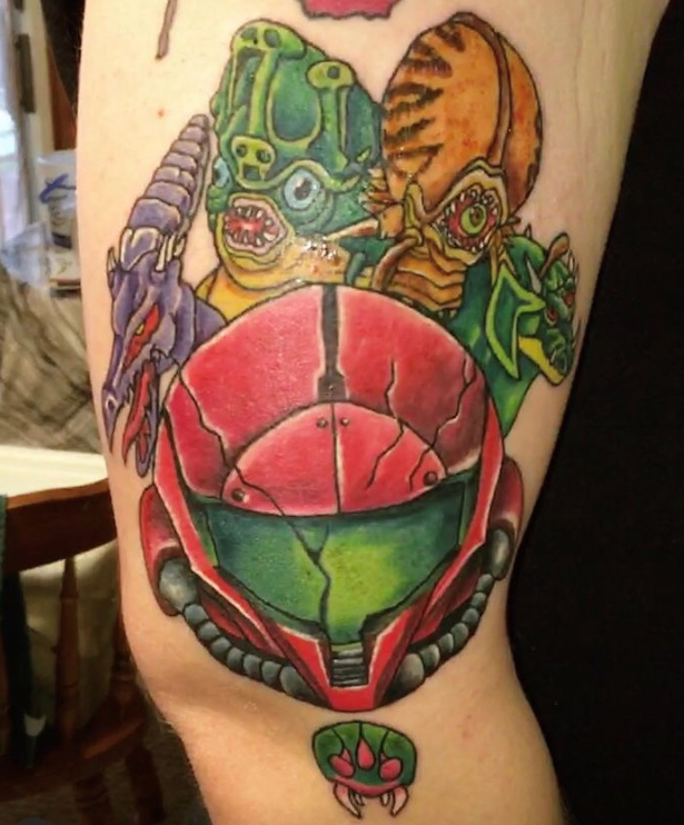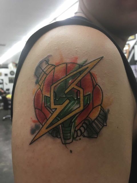 Mason has loved the Metroid series since he first played Metroid Fusion on the GameBoy Advance. He spent a little over six hours in the chair with this sick tattoo!