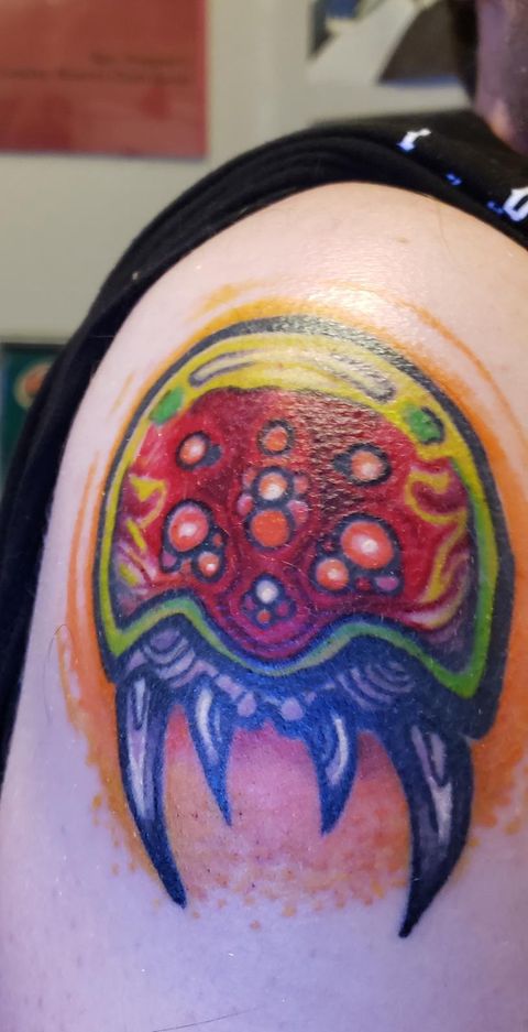 Danny from Glasgow got his tattoo back in 2017, spending about 2 hours in the chair. Metroid is his favorite series, and Super Metroid is his favorite of the favorites. His S-Logo incorporates the colors of both the Varia and Gravity suits!