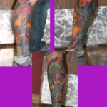 mordhau5’s leg-sleeve (leeve?) was a labor of love and a trial in patience. They spent TWENTY-FIVE hours collectively in the chair, but they were greatly rewarded with a beautifully intricate work of art. He also managed to hide his tat for TWO YEARS! :O