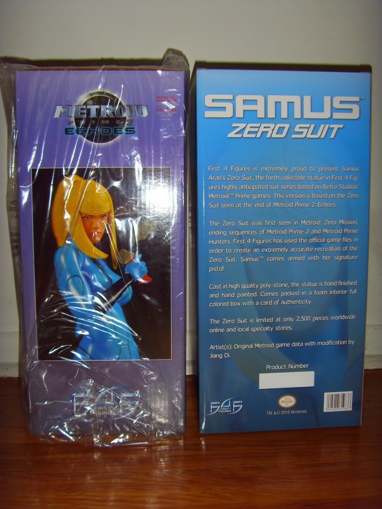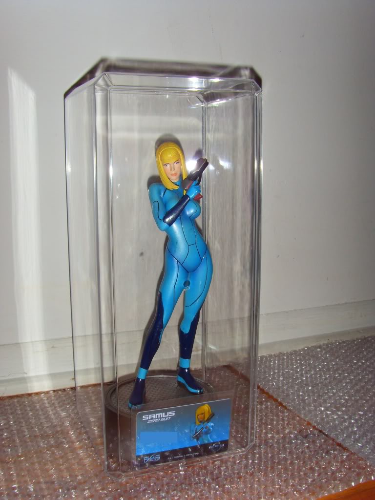 I purchase cases for all my F4F Metroid Statues. My Varia, Gravity, and Phazon suit samus all have individual glass cases protecting them. For Zero Suit I went the cheap route. I purchase an acrylic diecast model car display case (1/18 scale model) for ZZS. Even though its acrylic plastic, it does the job well for protecting and keeping the statue dust free.